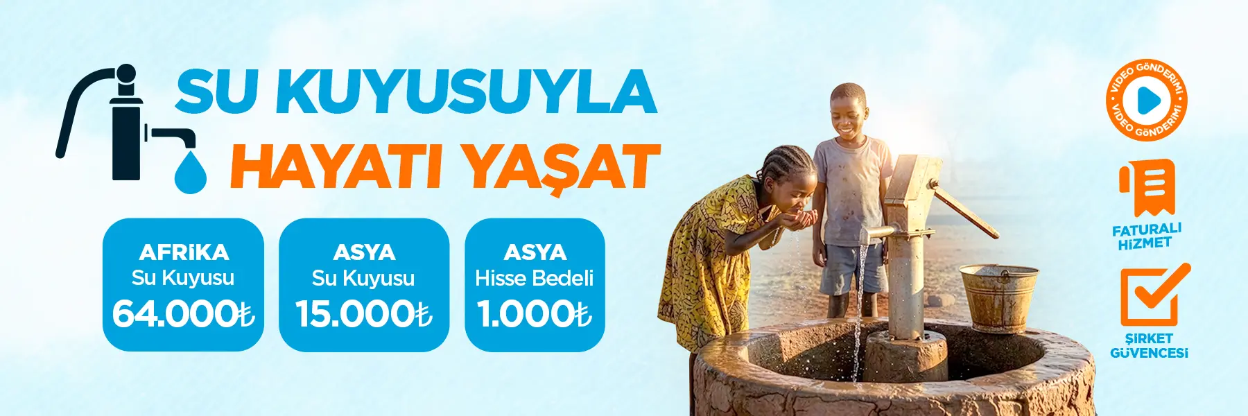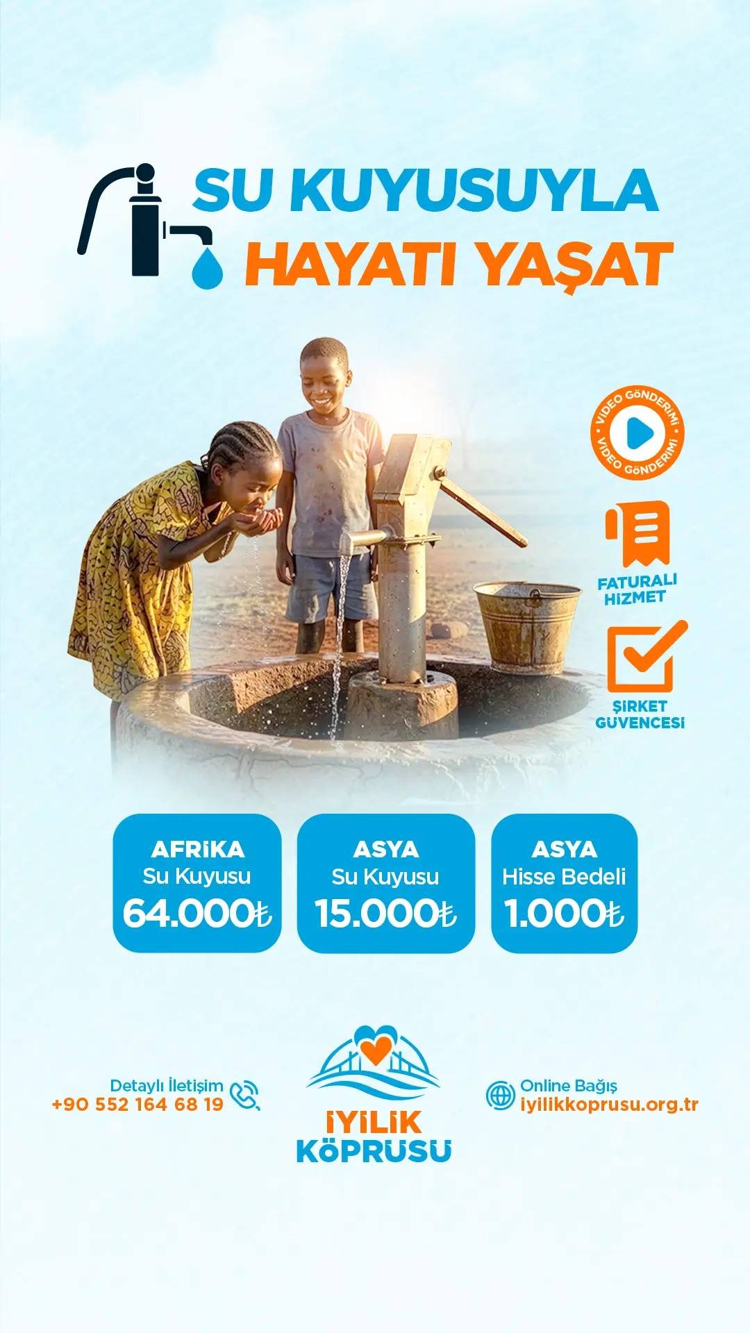 Su, hayatın en temel kaynağıdır ve günlük yaşamımızın vazgeçilmezidir. Suyun olmadığı bir yerde sağlık ve hijyen gibi temel ihtiyaçlardan söz etmek mümkün değildir. Bizler bu güzel vatanımızda suya kolayca ulaşabiliyorken, dünya genelinde birçok kişi bu imkâna sahip değil. İyilik Köprüsü, sizlerin destekleriyle Afrika ve Asya’da yüzlerce su kuyusu açarak susuzluğa karşı umut oluyor. Siz de bir su kuyusu hissesi veya tam bir su kuyusu bağışı ile bu hayra ortak olabilir ve amel defterinize bu iyiliği kaydedebilirsiniz.